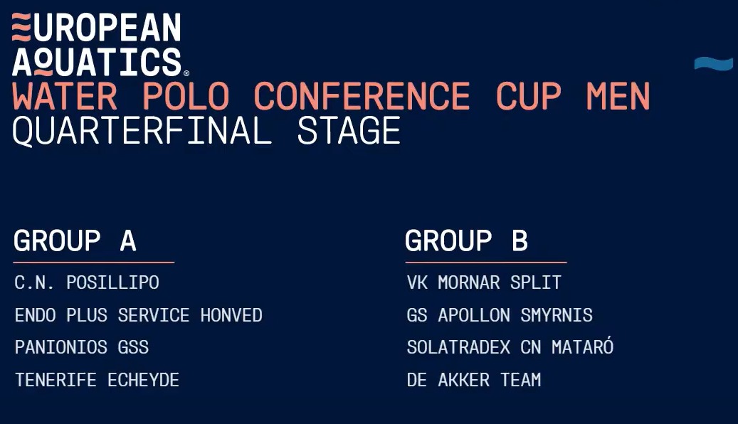 Određene su i četvrtfinalne skupine Konferencijskog kupa za muškarce. Turniri ovih skupina će se odigrati od 20. do 22. ožujka, a Mornar iz Splita je u društvu skupine B gdje su još grčki Apollon Smyrna, španjolski Mataro i talijanski De Akker iz Bologne čiji je kapetan Zagrepčanin Kristijan Milaković.
